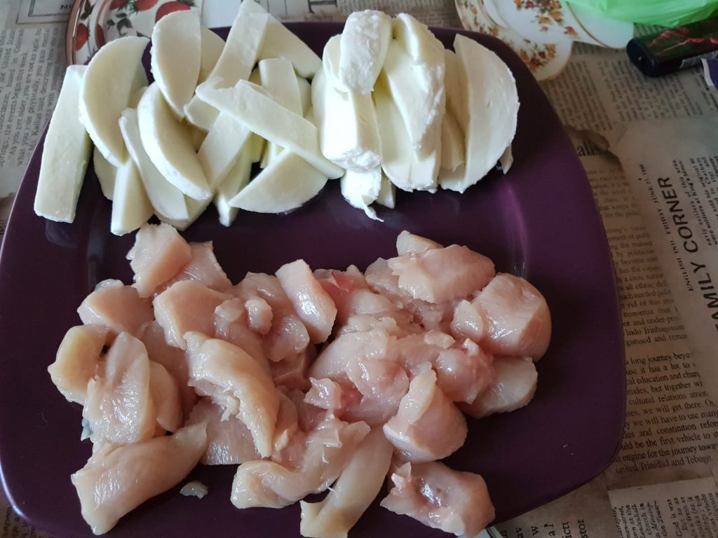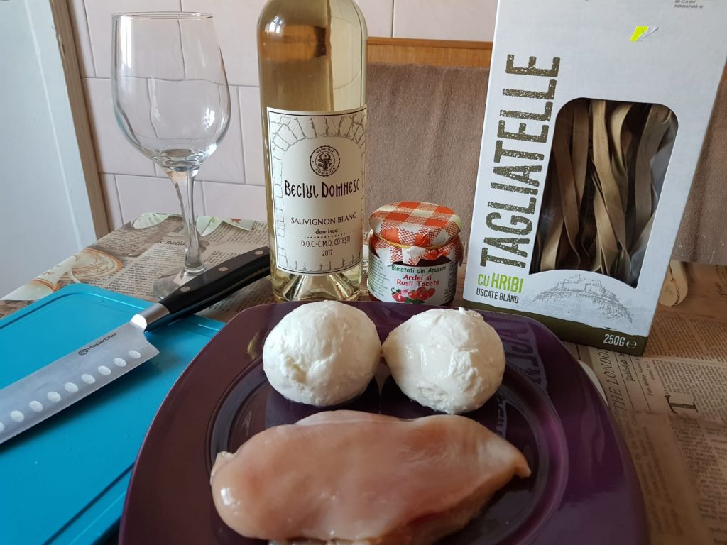 Se pun tagliatellele la fiert. Se taie pipetul de pui în bucațele mărunte. Mozzarella se taie fâșii (sau cubulețe) pentru a se putea topi rapid.