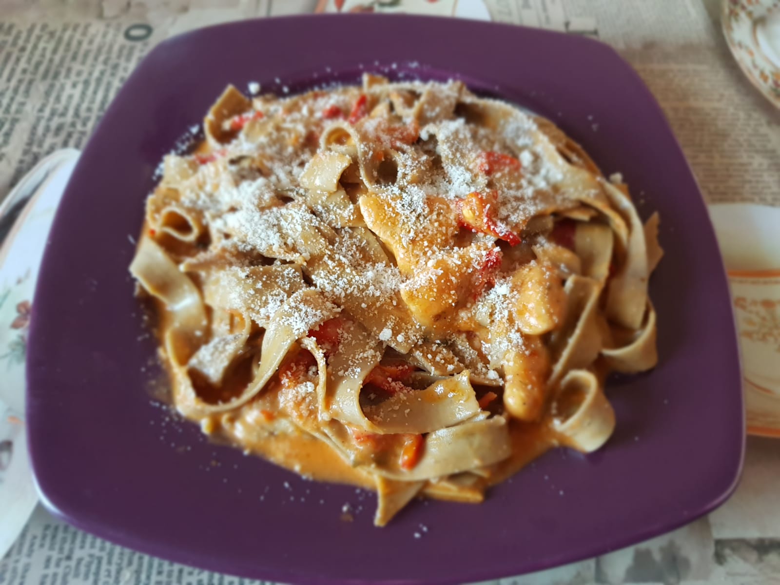 După ce s-a rumenit bine pieptul adăugăm sosul de ardei si roșii și 100 ml de vin alb. Lăsăm să fiarbă câteva minute.